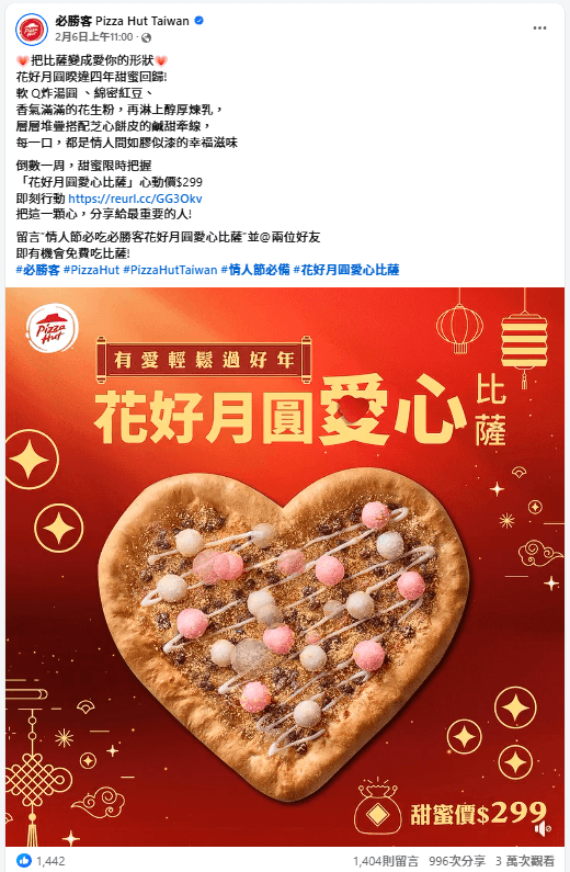 案例1:必勝客2026情人節限定「花好月圓愛心比薩」