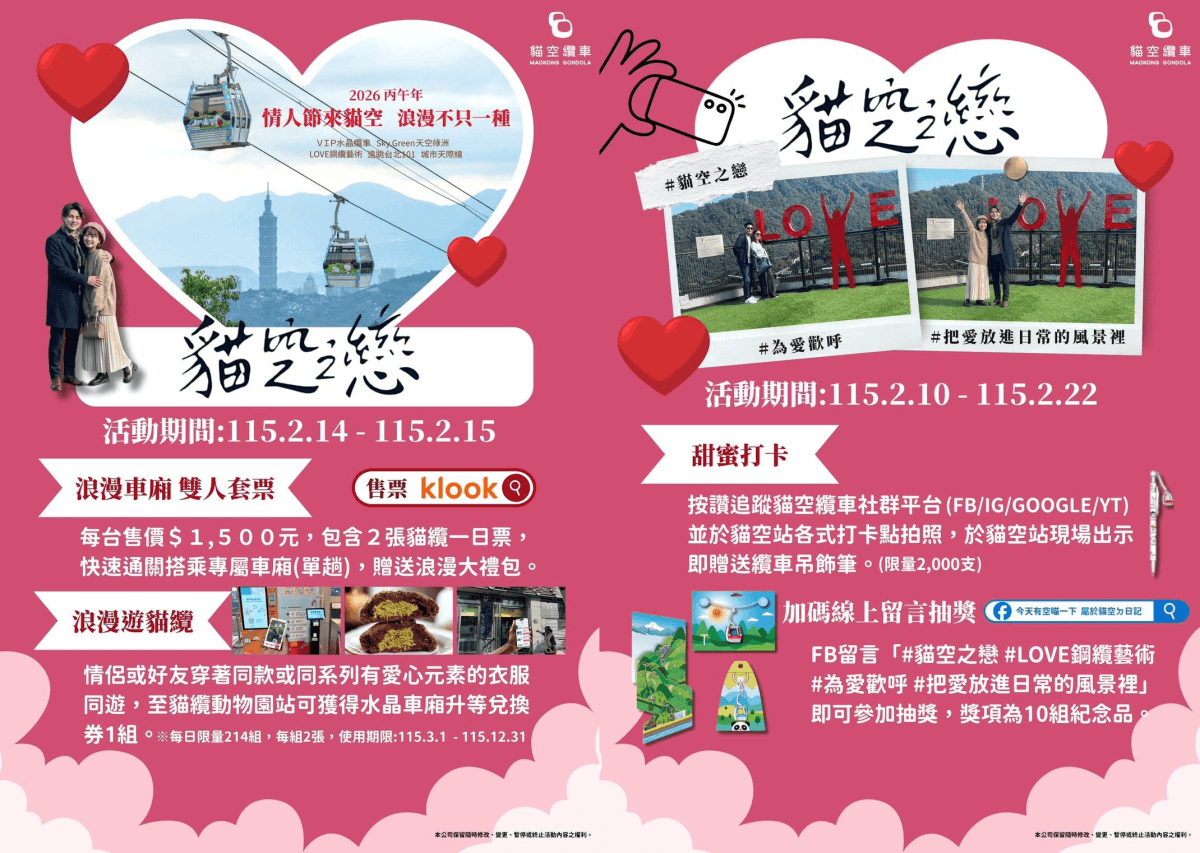 北捷遊憩公司推出貓空纜車情人節限定活動—「貓空之戀」,2月14日至15日推出專屬套票、甜蜜點心、互動拍照與穿搭活動,邀請遊客搭乘貓空纜車,在雲海、山景與城市天光之間度過浪漫佳節。
