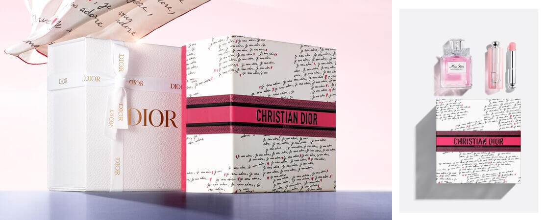 DIOR將暢銷《Miss Dior花漾迪奧淡香水》的浪漫色彩幻化為動人告白,搭配《迪奧癮誘粉漾潤唇膏》001經典粉,收入限量版愛戀宣言禮盒。禮盒外盒飾有“Je vous adore” (我愛你)的繾綣愛語,將禮物化為一份真摯的愛戀宣言。