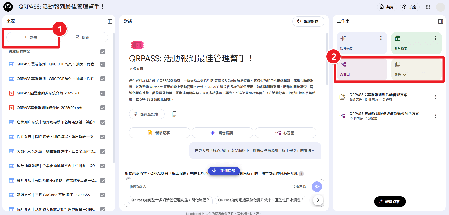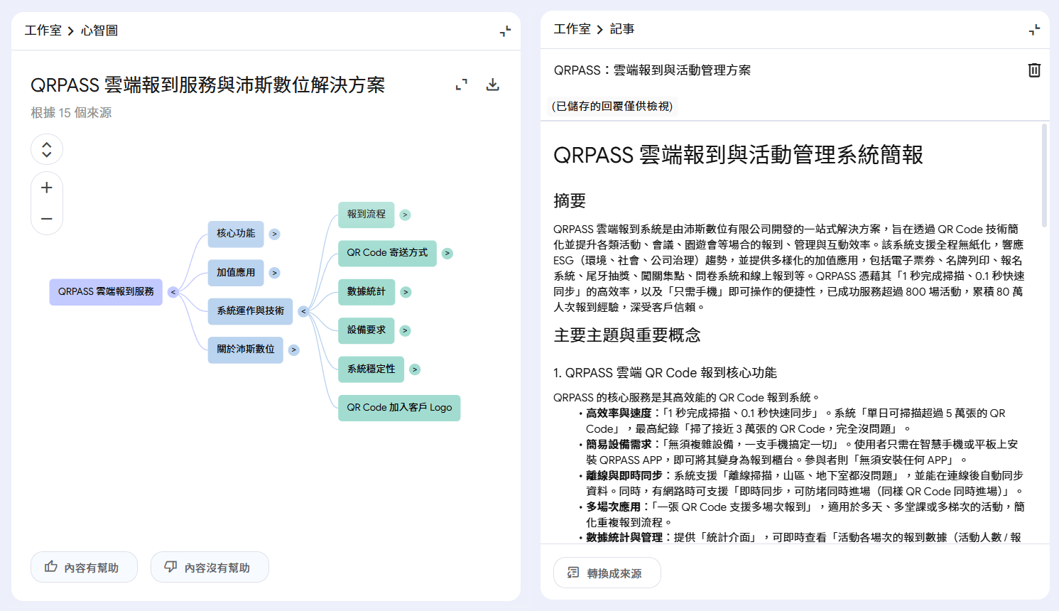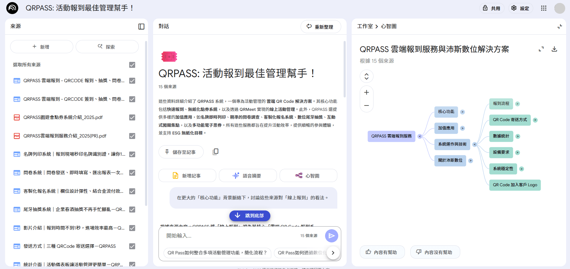 - 可以自動分析與內化使用者上傳的資料,建立專屬知識庫,為使用者回答問題、生成重點摘要、常見問答、學習指南、時間軸、心智圖等。