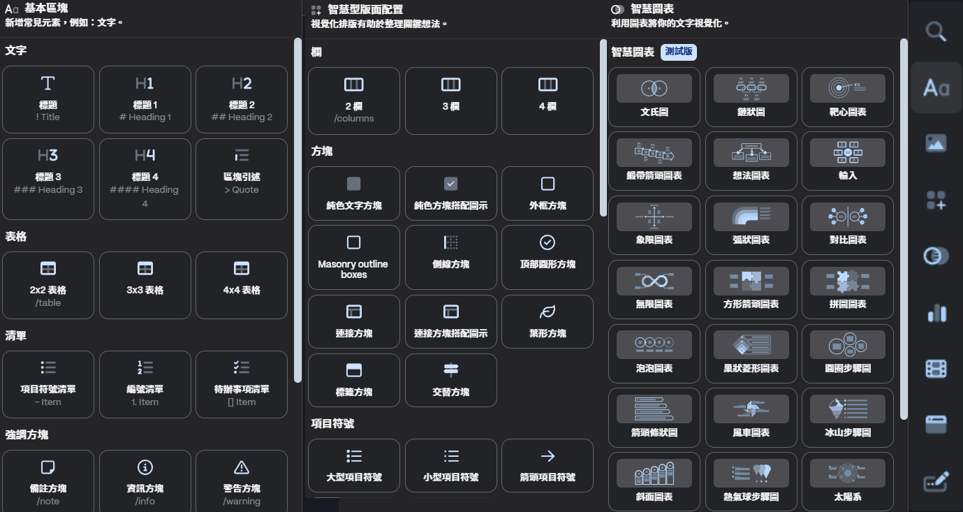 基本區塊的文字編輯、圖片、智慧型版面配置、智慧圖表、圖表與圖形、從熱門平台匯入媒體連結(Youtube/Vimoe/TikTok)、崁入應用程式和網頁、新增可互動式的表格與按鈕(Google Form)