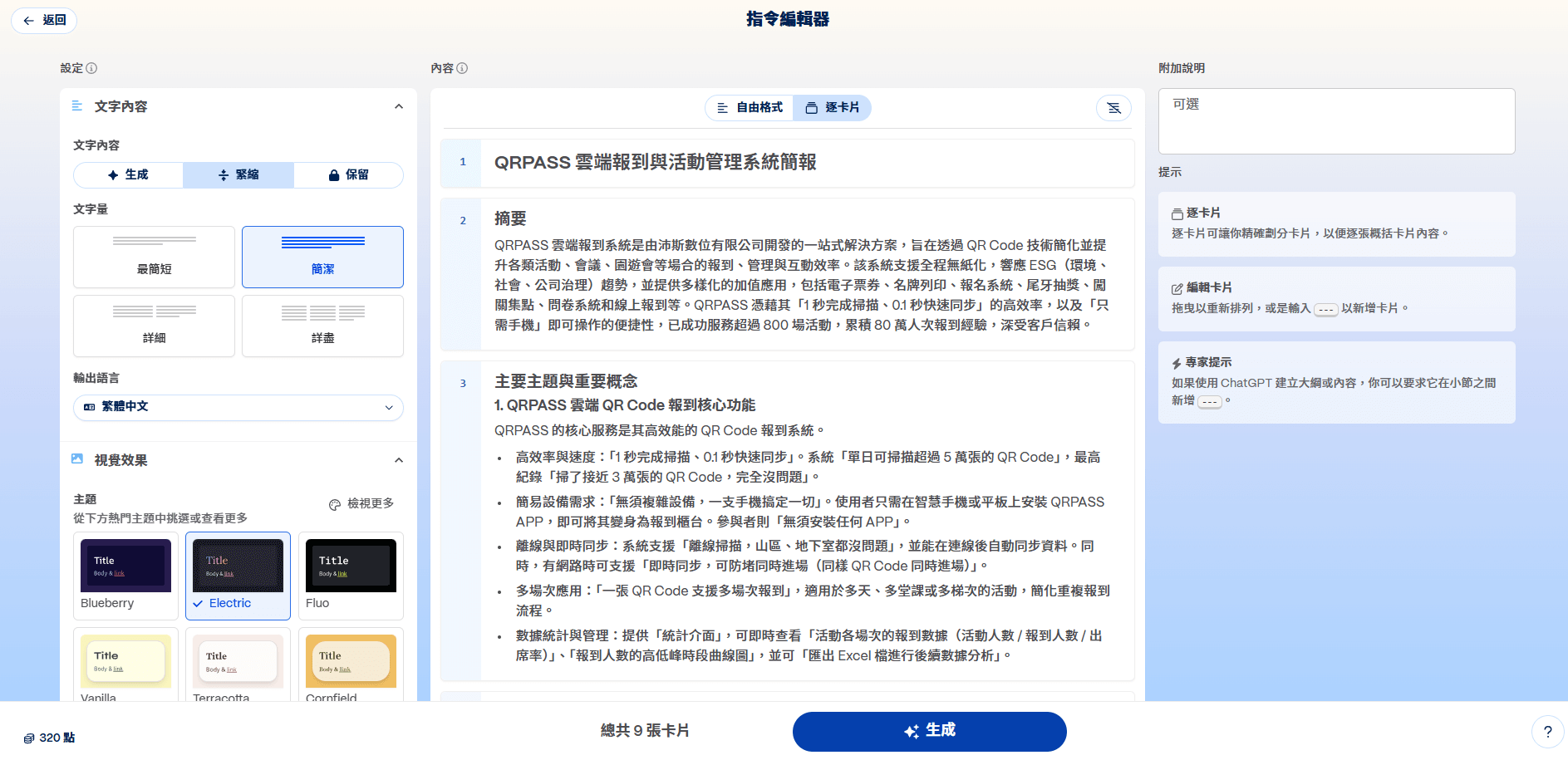 5.在指令編輯器介面調整好風格、文字量、每張卡的分隔處→生成✨