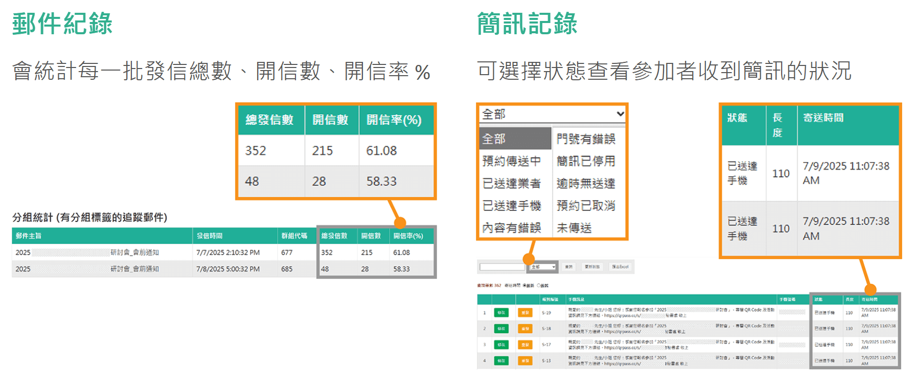 我們有提供電子郵件的開信率以及簡訊開啟 QR Code 的開啟率,提供您作為當日活動的參考,也可藉此了解當天活動可能的出席率。