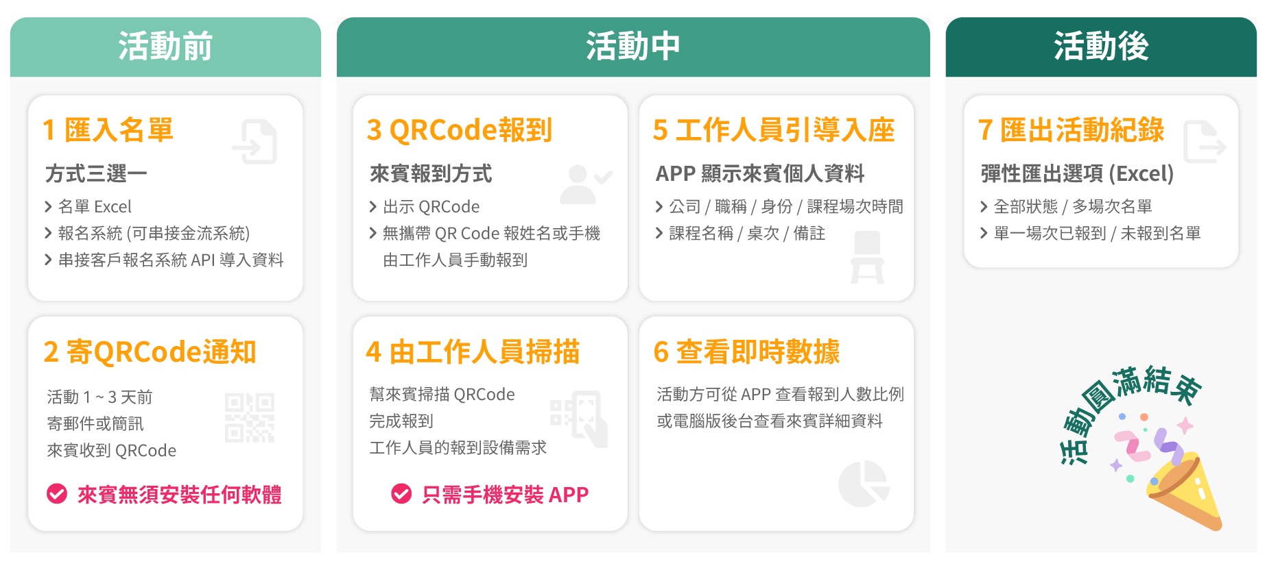 採用QRCode報到,實現1秒入場,節省時間並提升效率,讓參加者早點入場享受活動!