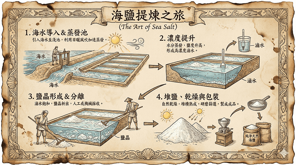 請你用手繪圖+文的方式製作一個資訊圖表,解釋[鹽如何從海水中被提煉出來],用鋼筆繪製在一張羊皮紙上,內容呈現要精緻且有架構,並且要利用適當的圖像來輔助呈現,尺寸 16:9