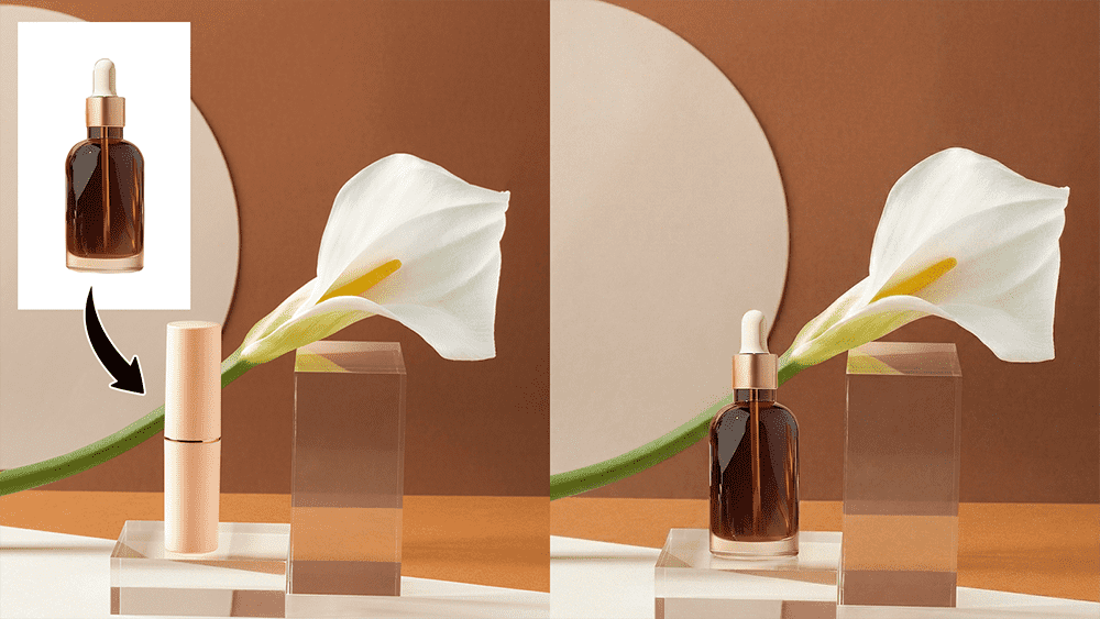 請把圖一中的口紅產品替換成圖二產品,產品要符合原圖的透視、光影,尺寸 3:4