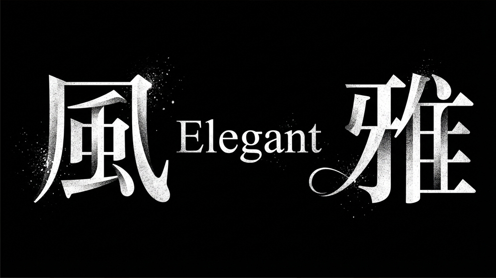 主體為裝飾性藝術字型 “風雅”,文字結合流線形與幾何結構,整體字型為白色且帶有顆粒噴濺質感;筆畫粗細變化豐富,曲線靈動且融合幾何硬朗邊緣,整體營造顆粒噴濺質感與黑白高對比效果,風雅中間分開加上一段英文字"Elegant",字體使用Times Roman 且字距要大,純黑色背景。尺寸 16:9